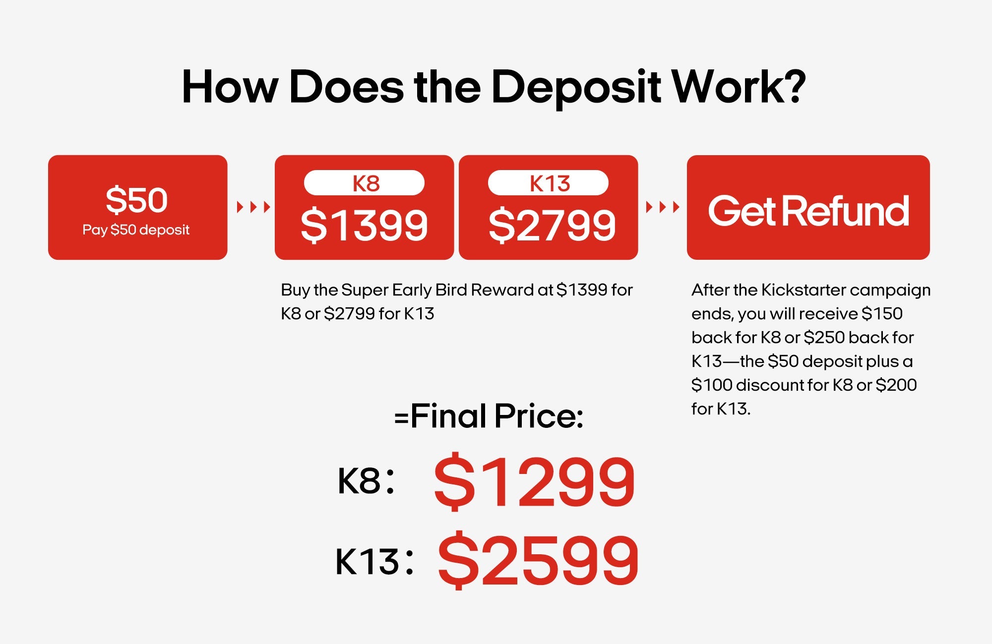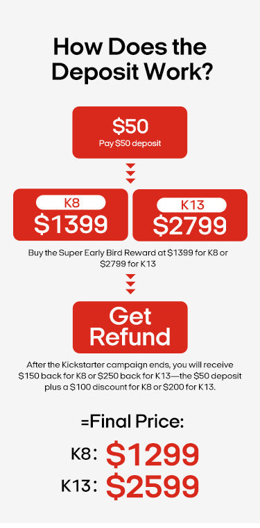 Your refundable $50 deposit and additional $100 discount for K8 or $200 for K13 will be refunded within 14 days after the Kickstarter campaign concludes.