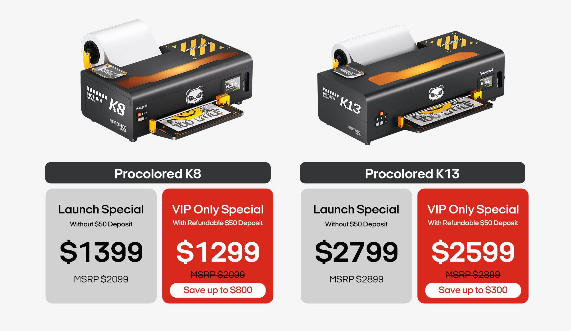 $50 Deposit VIPs: Unlock the exclusive VIP price of $1299 on Procolored K8 and $2599 on Procolored K13 during our time-limited VIP Special.